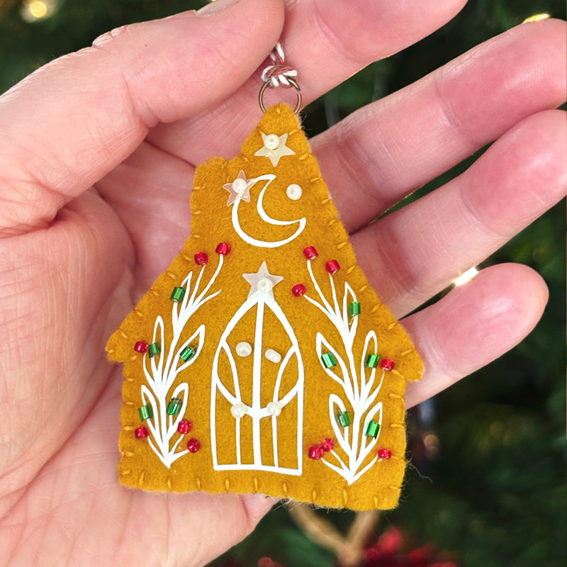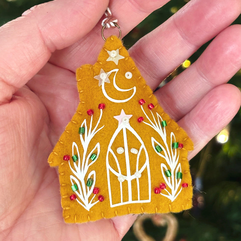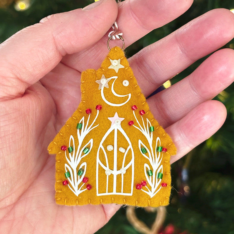 Suspension faite main. Feutrine en acrylique. Ouate de rembourrage en polyester recyclé. Foil phosphorescent. Perles