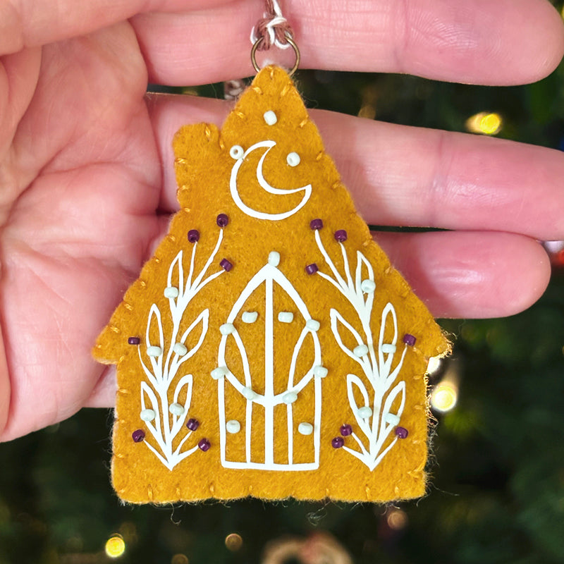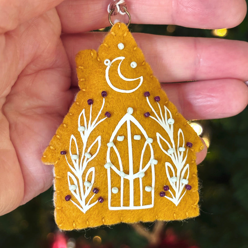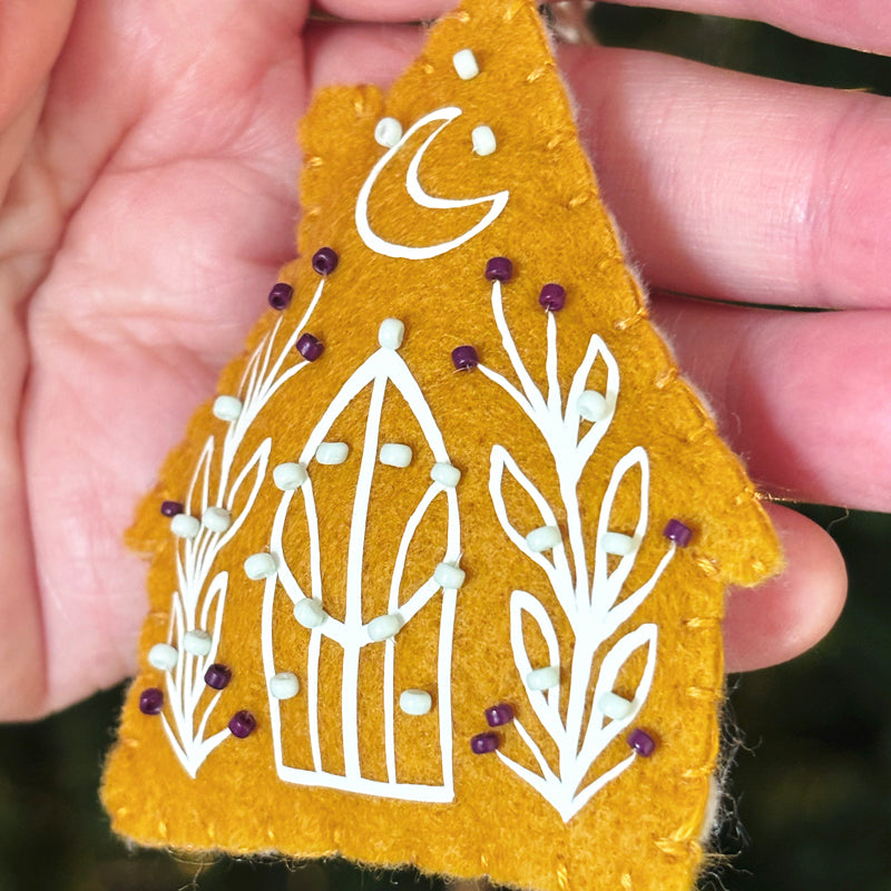 Suspension faite main. Feutrine en acrylique. Ouate de rembourrage en polyester recyclé. Foil phosphorescent. Perles