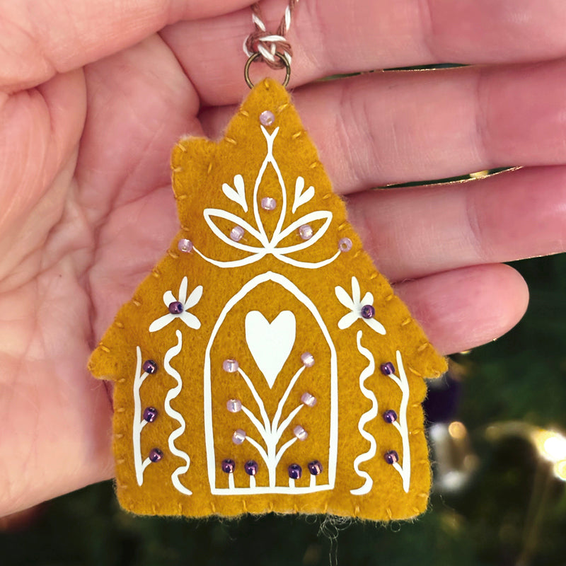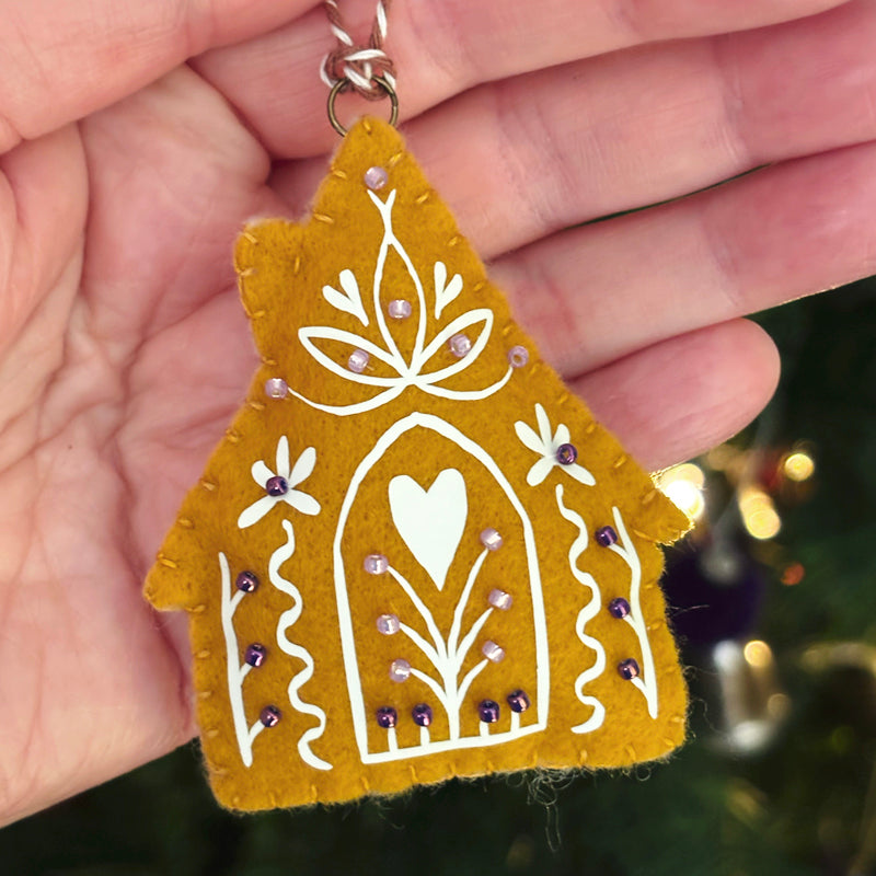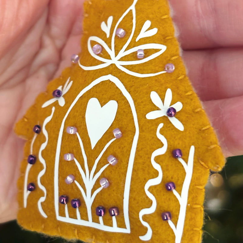 Suspension faite main. Feutrine en acrylique. Ouate de rembourrage en polyester recyclé. Foil phosphorescent. Perles